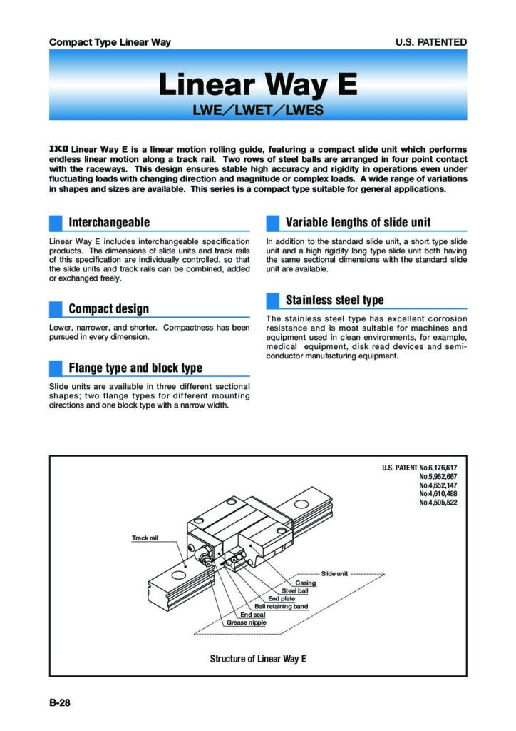 La Guida Lineare LWE appartiene alla serie di guide a ricircolo di sfere di IKO. Questa linea di prodotti ĆØ concepita per fornire movimento lineare preciso e regolare con un ingombro ridotto. Il carrello compatto scorre su una rotaia profilata grazie a due file di sfere che creano un contatto a quattro punti, garantendo rigiditĆ e stabilitĆ anche sotto carichi combinati. I componenti sono disponibili in diverse grandezze e lunghezze di corsa per adattarsi a sistemi di movimentazione leggeri e compatti.